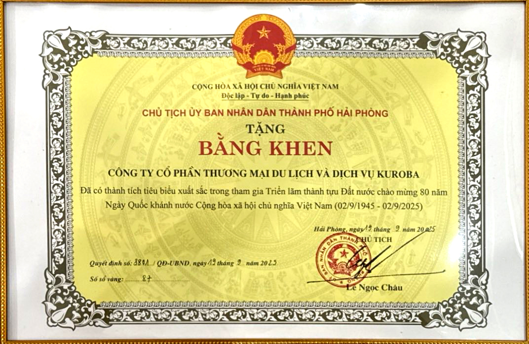 Ngày 20/9/2025, tại Hội nghị tổng kết công tác tham gia Triển lãm thành tựu đất nước nhân dịp kỷ niệm 80 năm Ngày Quốc khánh nước CHXHCN Việt Nam (02/9/1945 – 02/9/2025), Công ty Cổ phần Thương mại Du lịch và Dịch vụ Kuroba đã vinh dự được Chủ tịch UBND TP Hải Phòng trao tặng Bằng khen vì những thành tích tiêu biểu, xuất sắc.